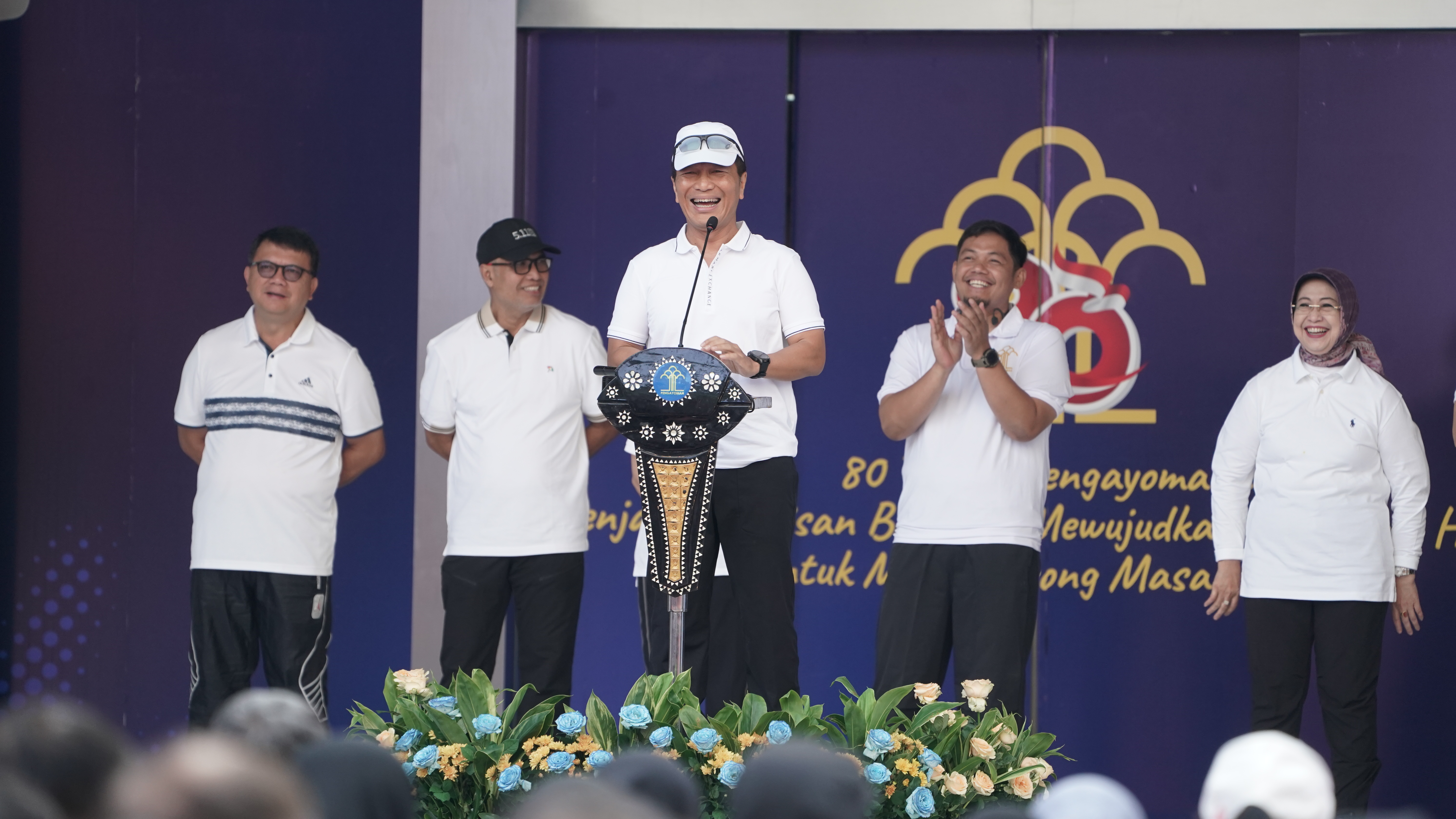 Jakarta - Dalam rangka memperingati Hari Pengayoman ke-80 tahun 2025, Kementerian Hukum menggelar apel pagi yang dirangkaikan dengan pembukaan pertandingan olahraga dan lomba tradisional. Kegiatan tersebut berlangsung di Lapangan Kemenkum pada Jumat, 22 Agustus 2025.