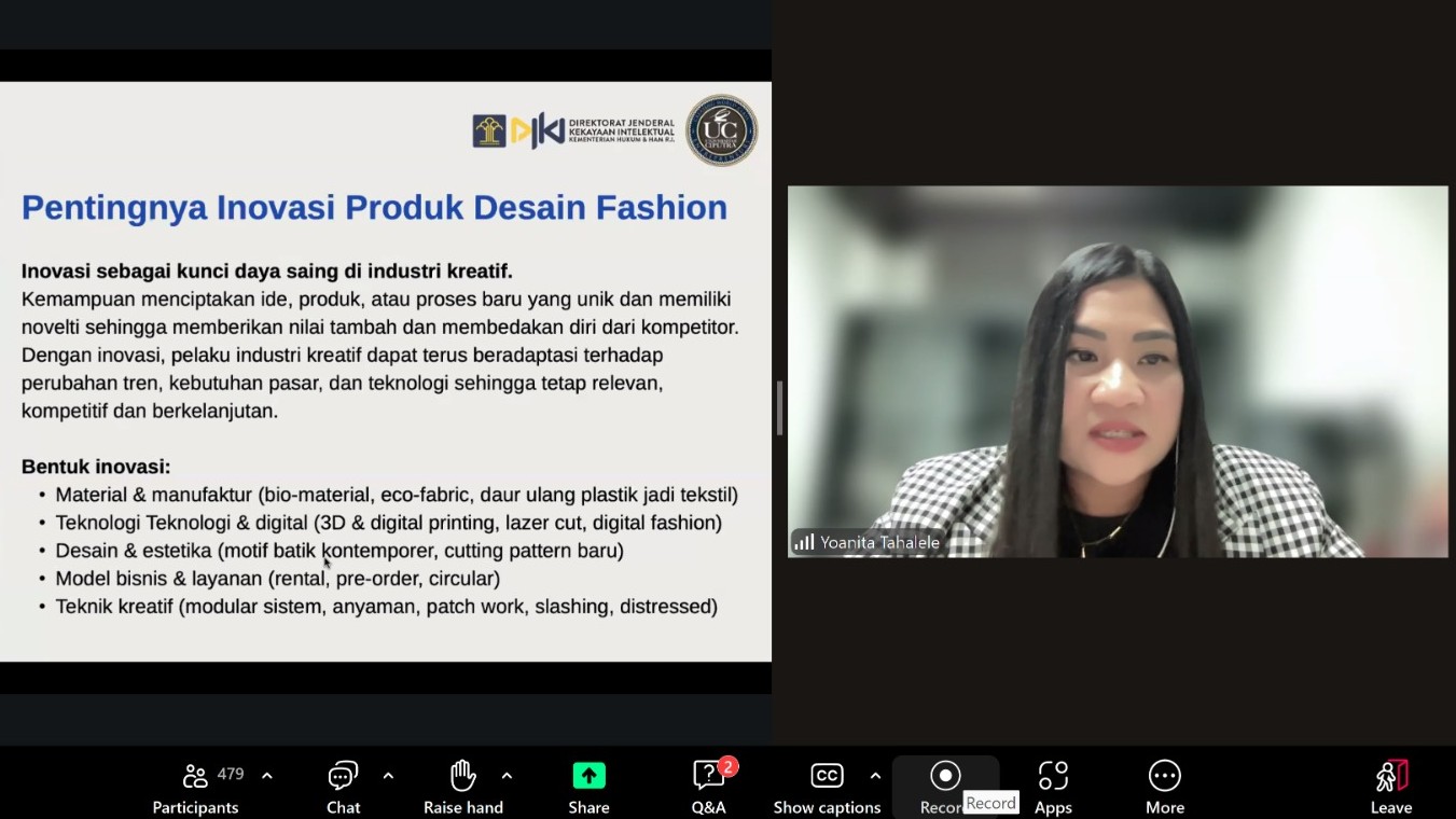 Yoanita menjelaskan bahwa inovasi menjadi kunci daya saing di industri kreatif karena memberikan keunikan, nilai tambah, dan diferensiasi. Perguruan Tinggi harus memastikan hasil riset dan karya mahasiswanya terlindungi melalui pendaftaran desain industri sebelum dikomersialisasikan.