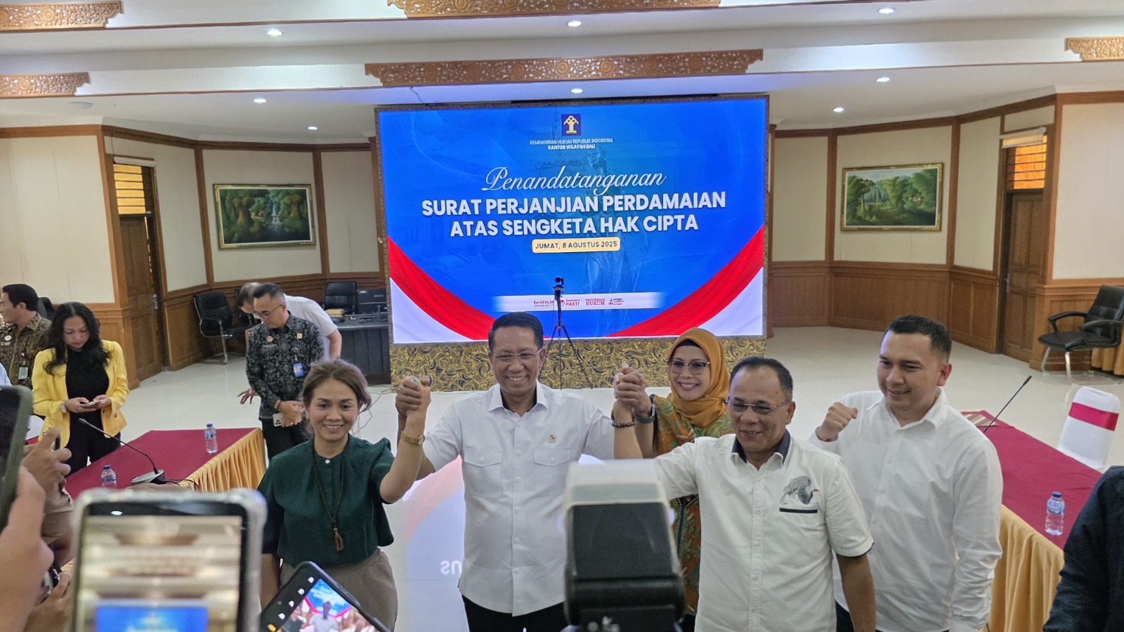 Bali - Menteri Hukum (Menkum), Supratman Andi Agtas, menyaksikan penandatanganan Surat Perjanjian Perdamaian atas Sengketa Hak Cipta antara Lembaga Manajemen Kolektif (LMK) Sentra Lisensi Musik Indonesia (SELMI) dan PT Mitra Bali Sukses (MBS) yang memegang lisensi merek Mie Gacoan, Jumat (08/08/2025).