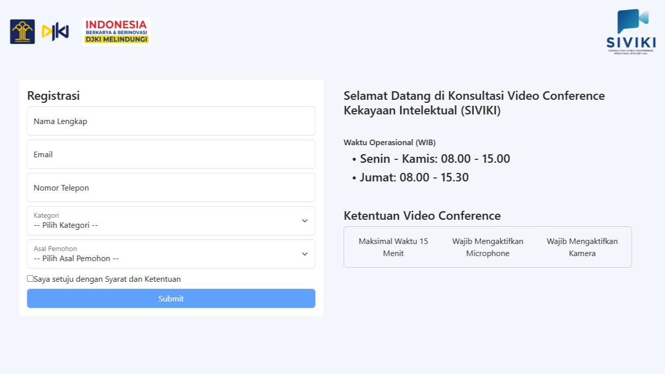 SIVIKI merupakan sarana konsultasi virtual berbasis video conference yang memungkinkan masyarakat memperoleh penjelasan langsung terkait prosedur, persyaratan, serta tahapan permohonan KI. Melalui layanan ini, DJKI berupaya meningkatkan pemahaman pemohon agar setiap proses pengajuan KI dilakukan sesuai ketentuan peraturan perundang-undangan.