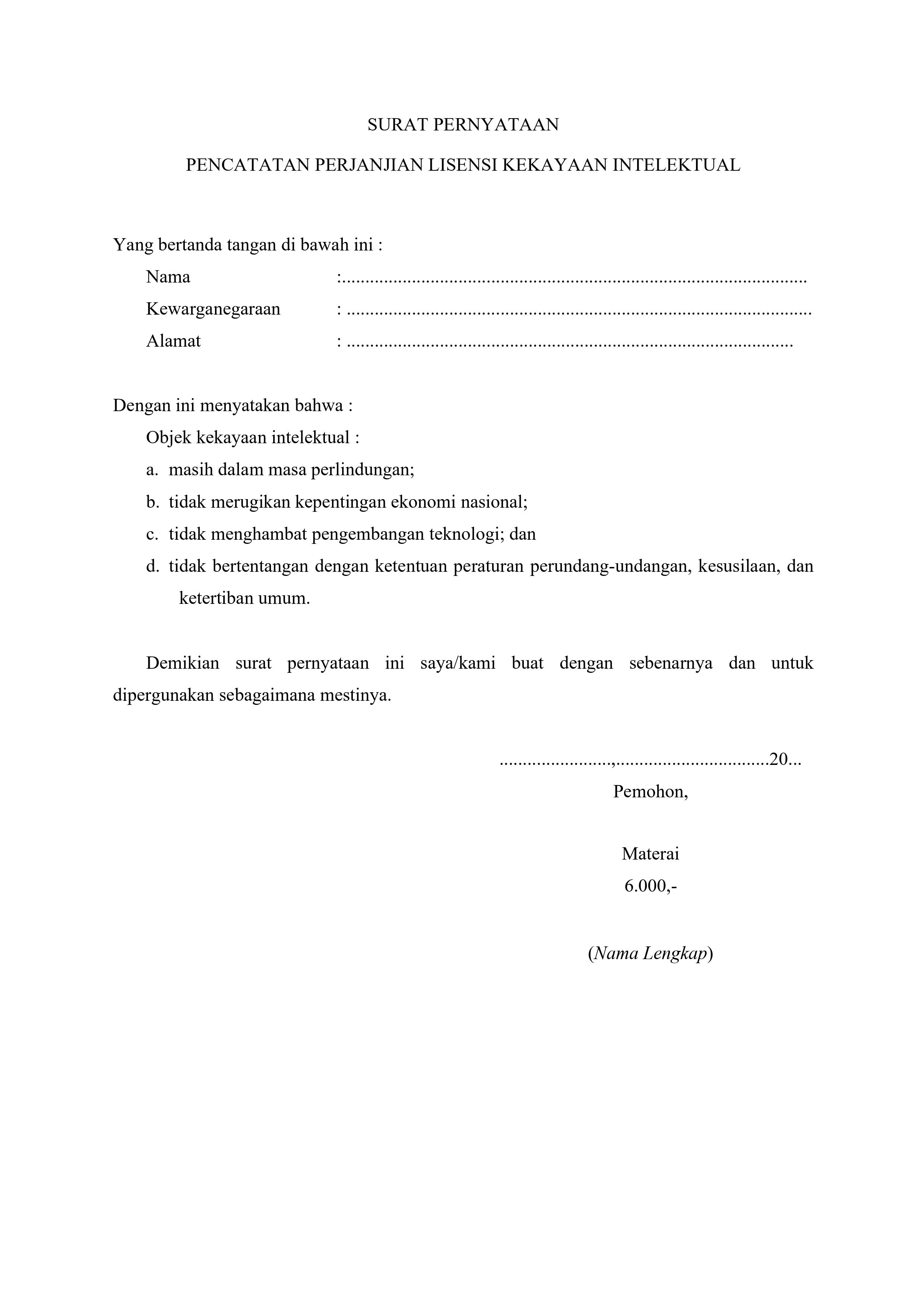 Surat Pernyataan Pencatatan Perjanjian Lisensi