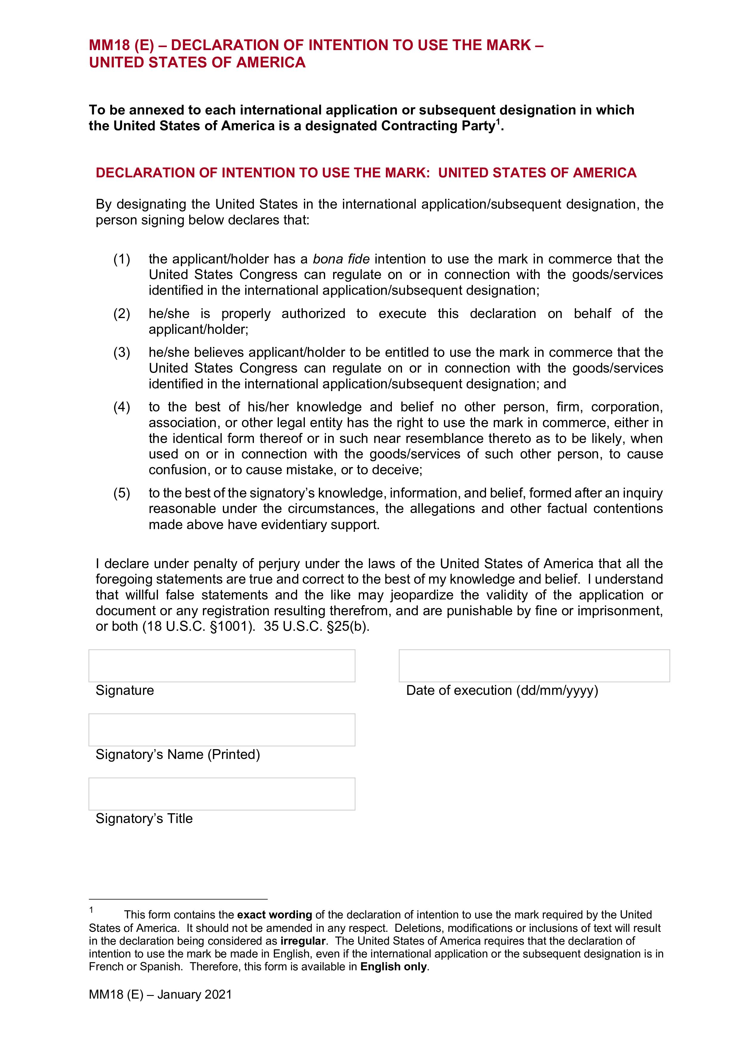 Form MM18 (Madrid Agreement Concerning the International Registration of Marks) - Amerika Serikat
