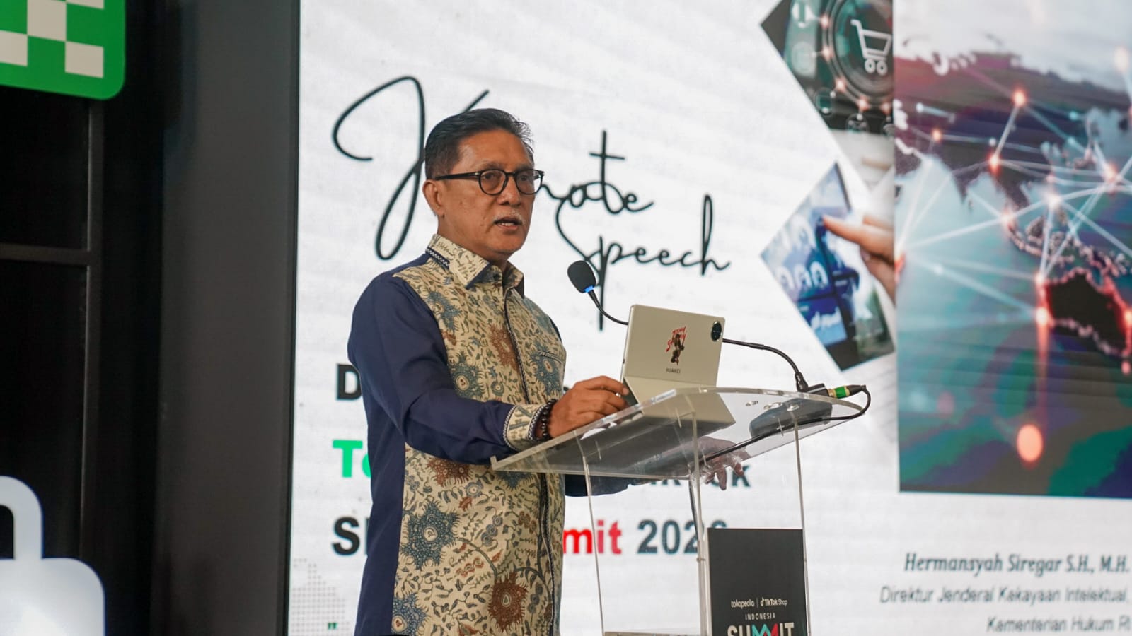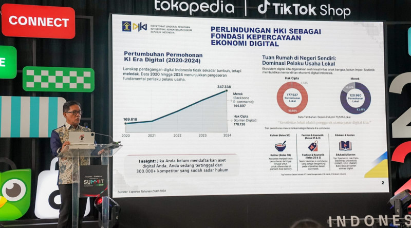 Jakarta - Direktorat Jenderal Kekayaan Intelektual atau DJKI terus memperkuat peran kekayaan intelektual (KI) sebagai fondasi pertumbuhan ekonomi digital nasional. DJKI diwakili oleh Direktur Kerja Sama, Pemberdayaan, dan Edukasi, Yasmon, hadir sebagai Keynote Speaker sekaligus Panelis dalam Tokopedia & TikTok Shop Summit 2026 yang diselenggarakan di Chillax Sudirman, Jakarta Selatan, pada 27 Januari 2026.