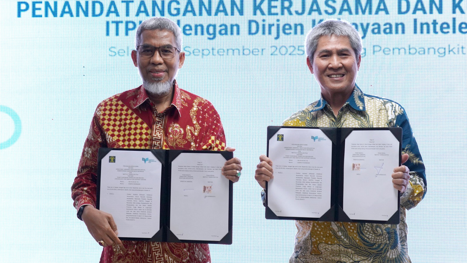 Jakarta – Direktorat Jenderal Kekayaan Intelektual (DJKI) Kementerian Hukum bersama Institut Teknologi PLN (ITPLN) menandatangani Perjanjian Kerja Sama (PKS) tentang Pusat Dukungan Teknologi dan Inovasi (Technology and Innovation Support Center/ TISC) pada Selasa, 30 September 2025, di Gedung Utama ITPLN, Jakarta.