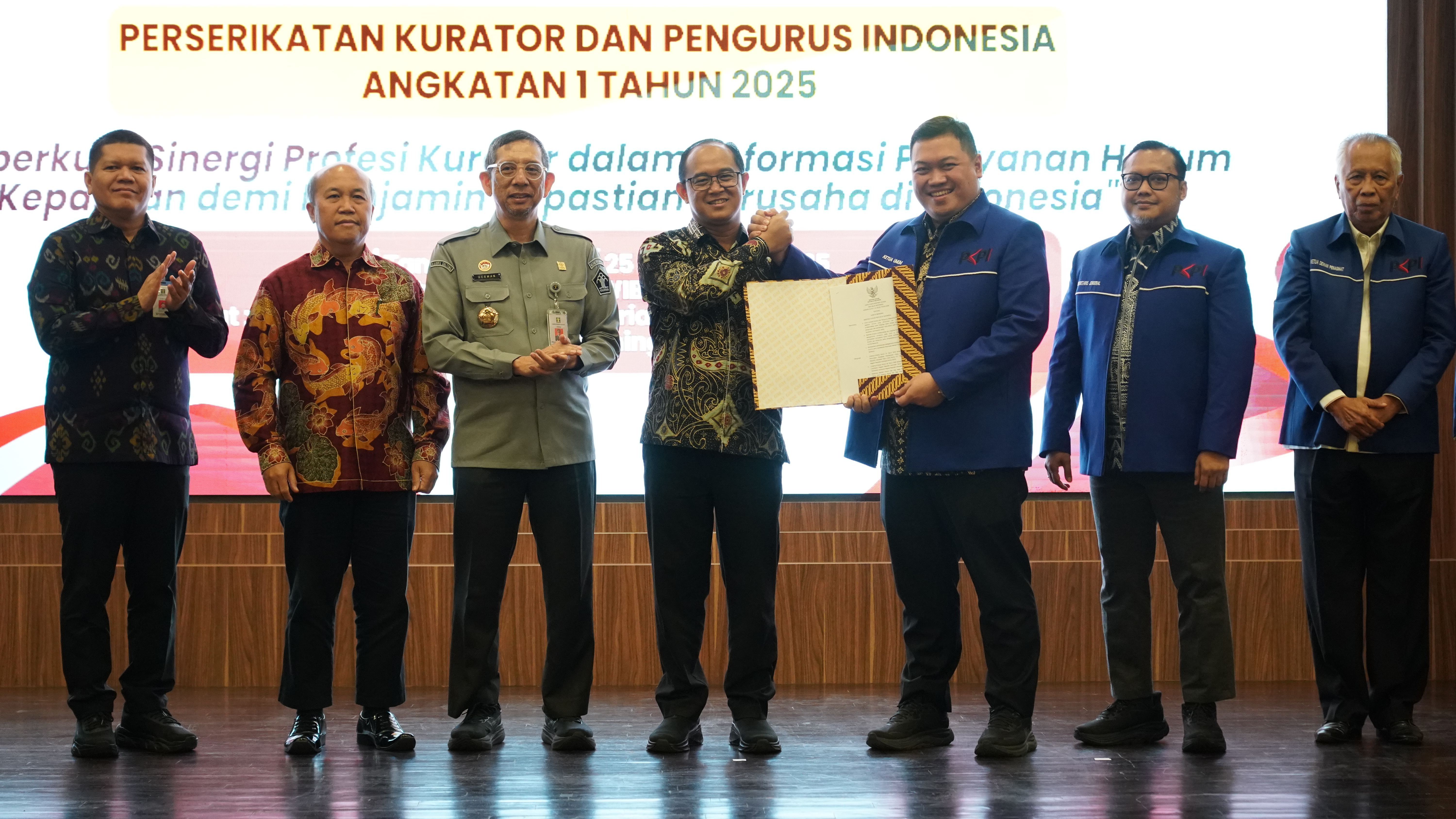 Jakarta - Plt. Direktur Jenderal Kekayaan Intelektual DJKI Hermansyah Siregar menghadiri Inaugurasi Perserikatan Kurator dan Pengurus Indonesia (PKPI) Angkatan 1 Tahun 2025. Kegiatan yang bertema “Memperkuat Sinergi Kurator dalam Reformasi Hukum Kepailitan demi Menjamin Kepastian Berusaha di Indonesia” digelar pada 25 November 2025, di Graha Pengayoman Kementerian Hukum RI, Jakarta.