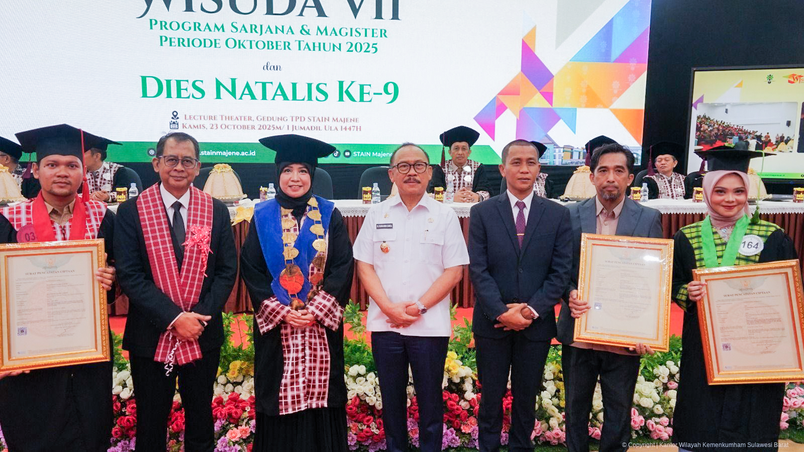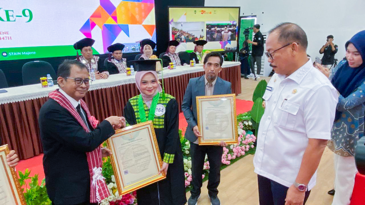 Sementara itu, Gubernur Sulawesi Barat H. Suhardi Duka dalam orasi ilmiahnya menekankan pentingnya integritas dan daya saing sumber daya manusia Sulawesi Barat sebagai kunci pembangunan daerah. Ia juga menyampaikan terima kasih atas dukungan Kementerian Hukum dan STAIN Majene dalam memperkuat pelindungan hak cipta di wilayahnya.