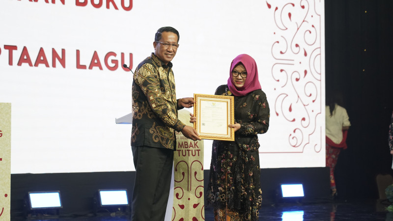 Direktur Jenderal Kekayaan Intelektual, Razilu dan Direktur Hak Cipta dan Desain Industri, Agung Damarsasongko mendampingi Menteri Hukum, Supratman Andi Agtas, memberikan surat pencatatan ciptaan buku dan lagu kepada Tutut Soeharto pada acara peluncuran buku berjudul “Selangkah di Belakang Mbak Tutut” di Balai Sudirman Jakarta, Jumat, 15 Agustus 2025.